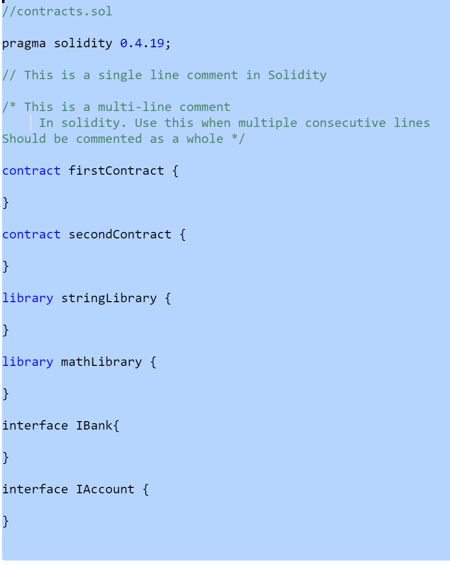 Apart from pragma, import, and comments, we can define contracts, libraries, and interfaces at the global or top level. We will explore contracts, libraries, and interfaces in depth in subsequent chapters. This chapter assumes that you understand that multiple contracts, libraries, and interfaces can be declared within the same Solidity file. The library, contract, and interface keywords shown in the following screenshot are case-sensitive in nature: