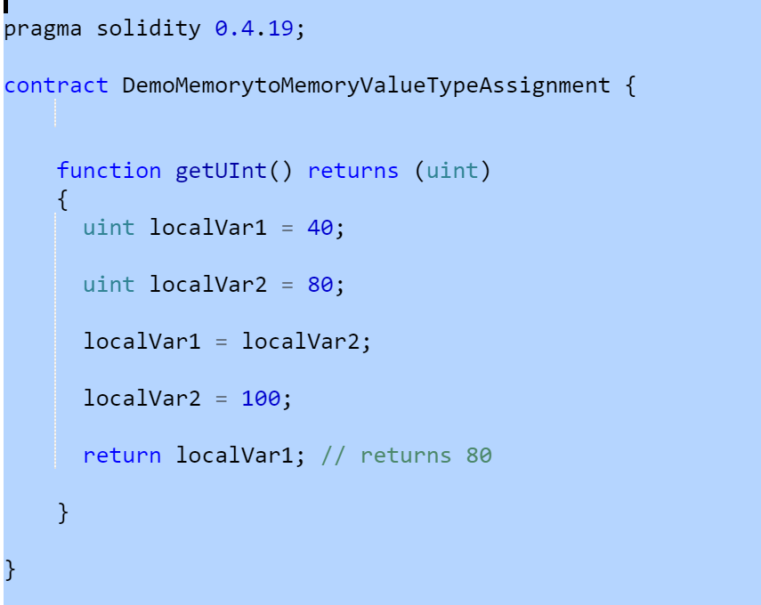 Assignments to a memory variable from another memory variable do not create a copy for reference types; however, they do create a new copy for value types. The code listing shown in the following screenshot illustrates that value type variables in memory are copied by value. The value of localVar1 is not affected by change in value of the localVar2 variable: