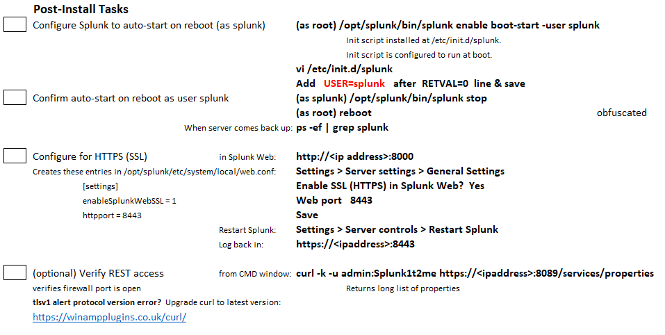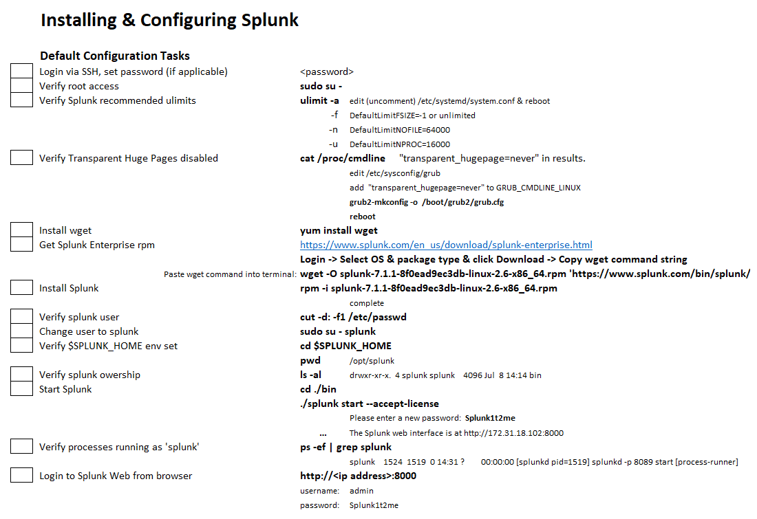 The next part of the document is a checklist that contains the installation steps that pertain to all of the Splunk servers—in this example, for Linux. We'll continue the spreadsheet that we've just started with this list: