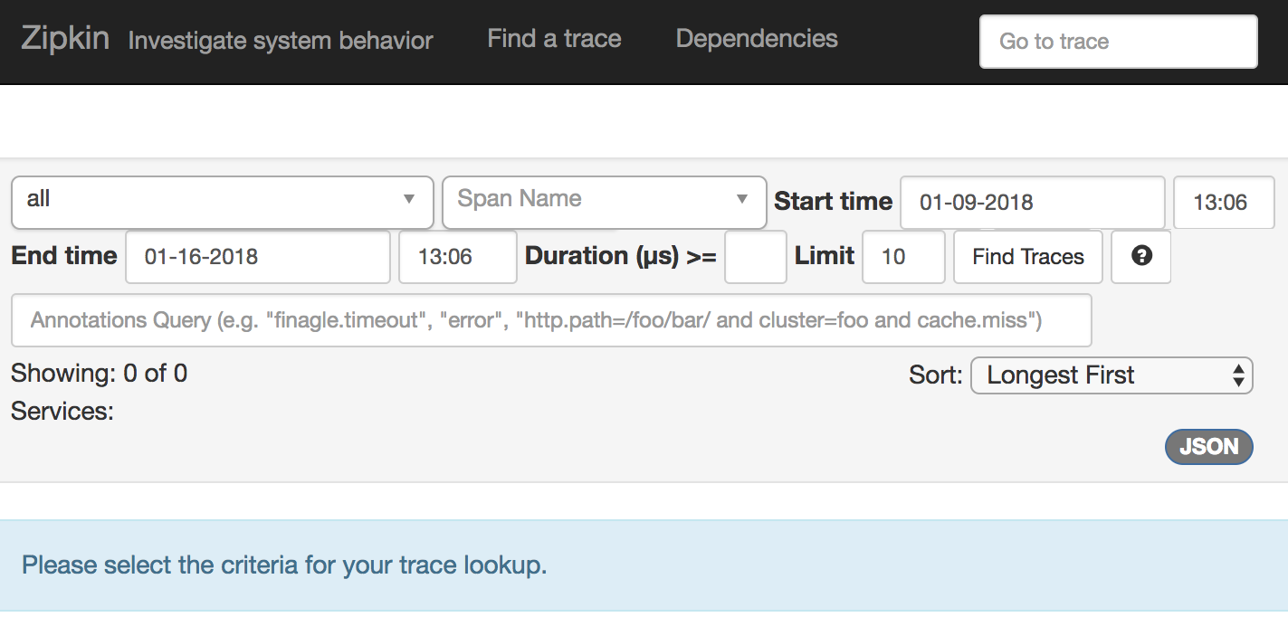 Good job – the Zipkin server is running now. We can take a look at the index page to see what it looks like.