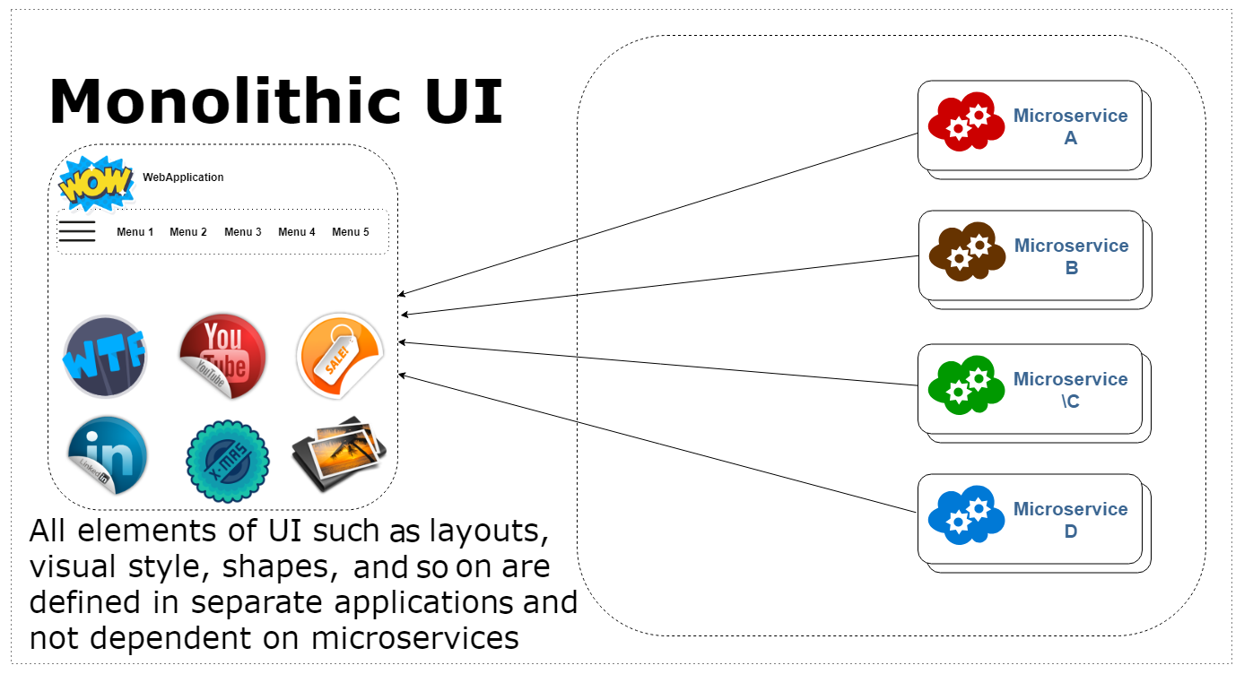 The clear benefits of this approach are an easy implementation and UI consistency across the application because everything is in a single place. On the downside, there may be a good amount of conflict regarding library versions, styling, ...
