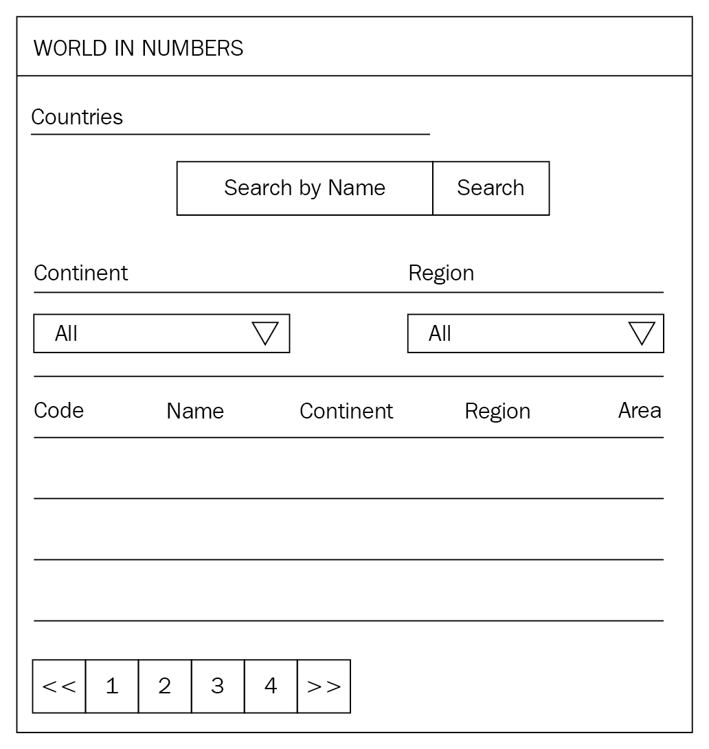 We will make it simple. The home page shows the country list with pagination, and allow searching by country name and filtering by continent/region. The following would be the home page of our application: