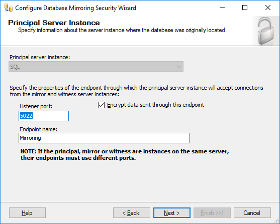 First, you need to configure the security, where you will define your principal, witness, and mirror servers including their port numbers. These port numbers will be used in creating endpoints on each SQL Server, which will be used for mirroring sessions, as can be seen from the following image: