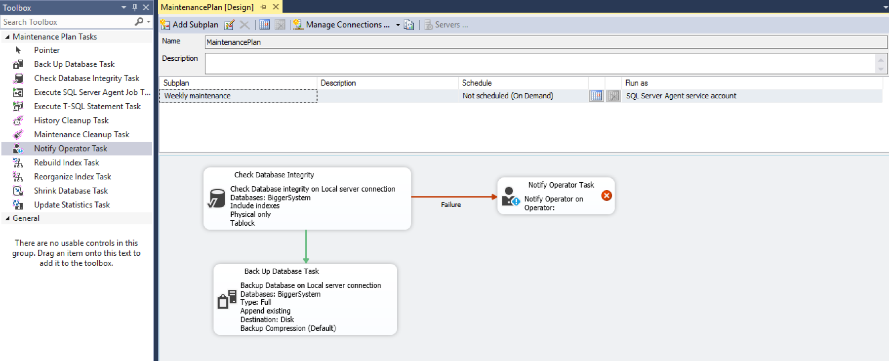 The maintenance plan wizard hides one very interesting thing: maintenance plan definition is actually a kind of Integration Services package. Creation of a new plan is available as well as the edit feature for existing ones.