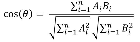 Example: Let us assume A = [2, 1, 0, 2, 0, 1, 1, 1], B = [2, 1, 1, 1, 1, 0, 1, 1] are the two vectors and we would like to calculate the cosine similarity: