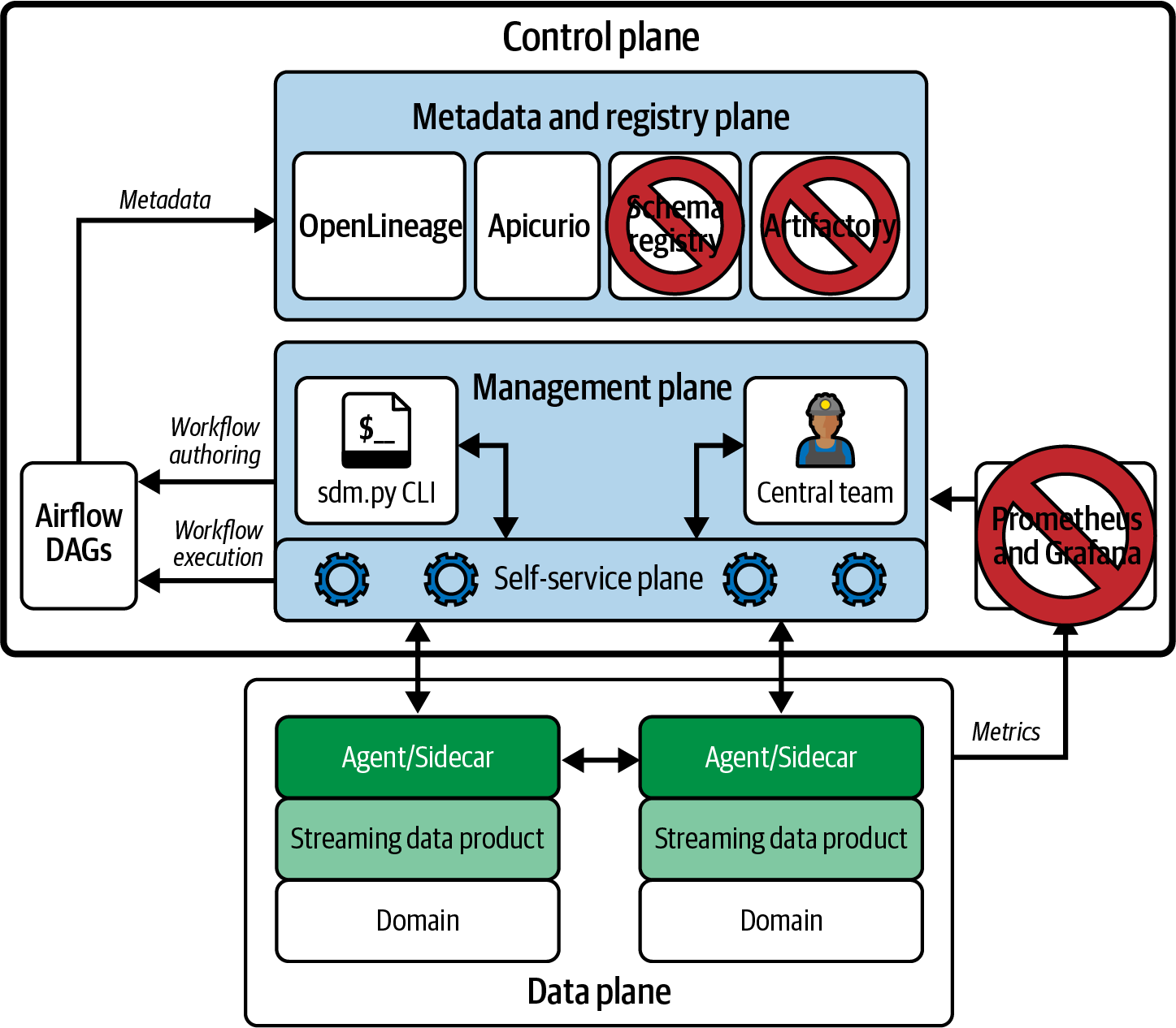 Figure 10-1 shows the streaming data mesh example that we will use in this chapter. The control plane in this example does not have all the components that appear in the latter part of Chapter 7. It includes only the necessary components to build, publish, and share streaming data products across domains: