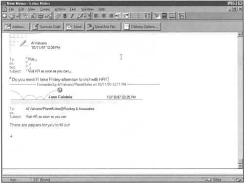 Forwarding a mail message inserts one mail message into another so that the original header information stays intact. Complete the TO: and Subject: lines and add your comments above the Forwarded by line. Click the Send tool button to send the message.