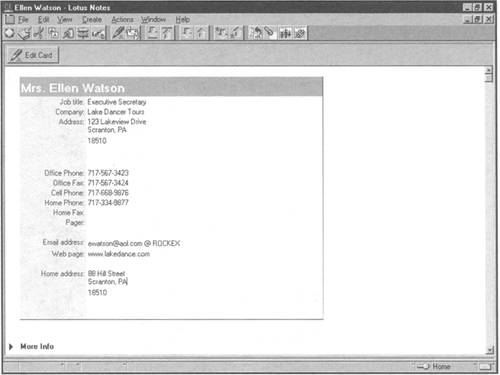 The information you store about a person— email address, company, and so on—appears in a Business Card document, such as the one shown in Figure 9.3.