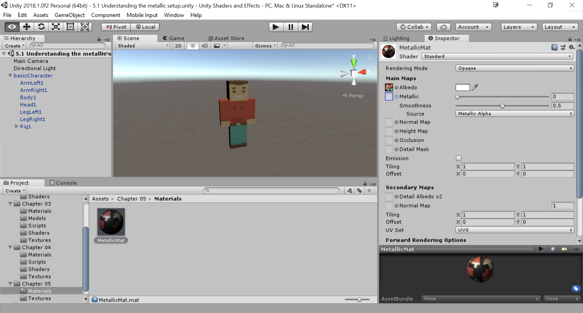 - You will also need a textured 3D model. Our basic character we've been using previously will work perfectly. Drag and drop it into the scene. Afterward, drag and drop the MetallicMat material onto each of the parts of the character. Also, assign the texture for the material to the Albedo property: