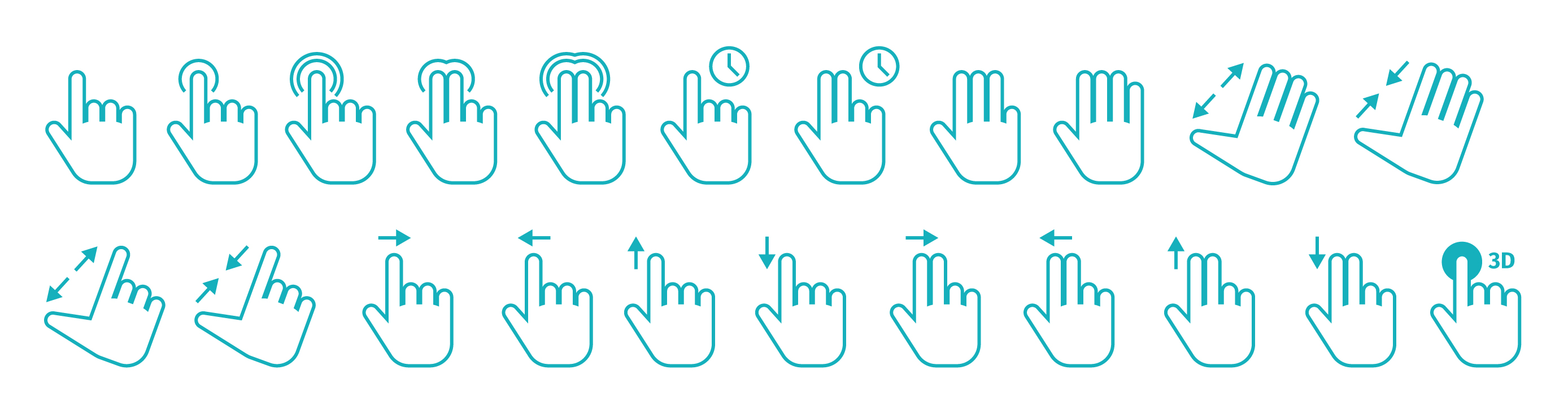 An application may react to different types of gestures. These gestures can be represented with hand icons or with labels. In this way, dynamic interactions can be captured in a static image and describe what triggers each transition between two screens. In addition to navigation, you can also represent interactions happening in a single screen. You can indicate that the user is able to zoom in an image or the functionality behind a force touch or a long press. In the following link, you have a set of gestures that you can use and freely modify in your projects [Asset_A6462_A05_A01_Gestures_Assets.ai].