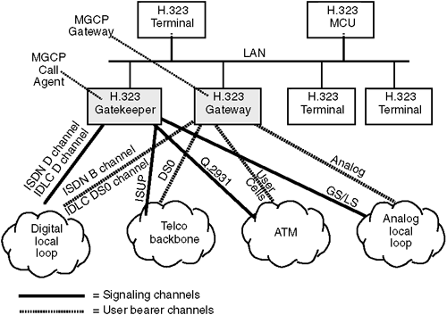 The relationship of MGCP to H.323 is shown in Figure 9-10. Be aware that MGCP does not have to be a part of H.323, but if it is, the MGCP Call Agent acts as an H.323 Gatekeeper. This approach is in keeping with the functions of the H.323 Gatekeeper, who provides address translation and call control services to H.323 endpoints.