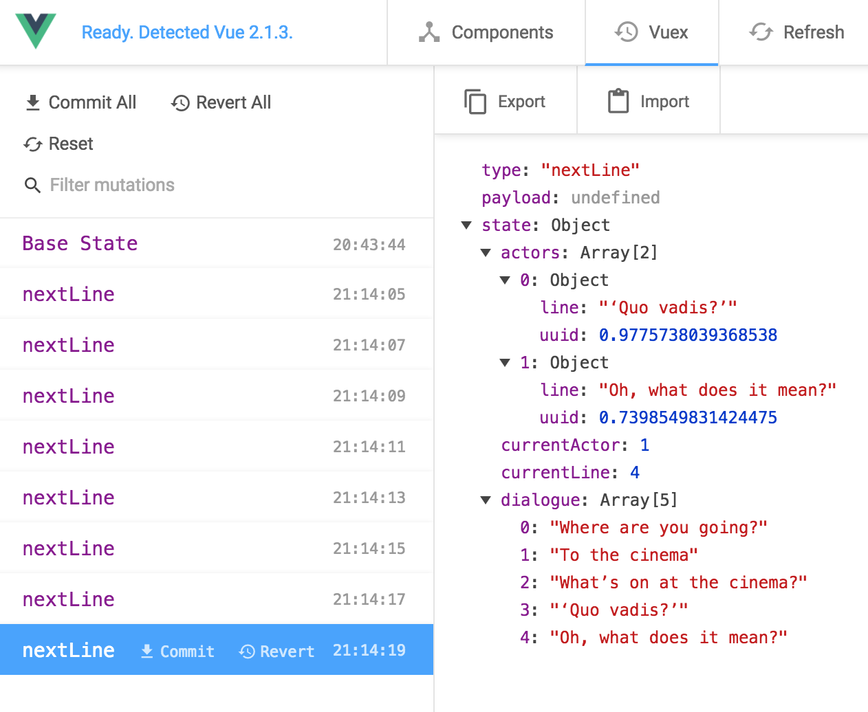 Every 2 seconds, there should be a new nextLine mutator. I suggest that you also expand the actors array and see what's inside. You can even take a peek at the currentActor and the currentLine and watch them go in circles.