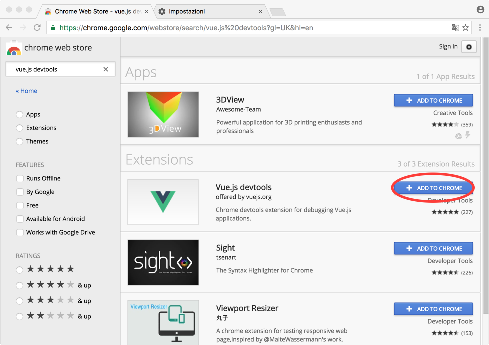 To install it, you just have to download the extension from the Chrome Web Store in the extensions category. Just look for Vue.js devtools and you'll find it right away, press the ADD TO CHROME button, and you're set to go: