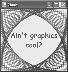 As nifty as all the built-in controls are and as nicely as you can arrange them on forms using the Designer, user controls, and dialogs, sometimes you need to take things into your own hands and render the state of your form or control yourself. For example, if you need to compose a fancy About box, as shown in Figure 1.17, you'll need to handle the form's Paint event and do the drawing yourself.
