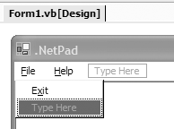As interesting as forms themselves are—with their lifetime, adornments, transparency settings, and input options—they're all the more interesting with controls on them. But before we get into managing a form's controls in general, we need to take a quick look at menus, which have special support in WinForms. Not only does VS.NET have a special Menu Designer (as shown in Figure 2.7), but also, unlike every other control, a Form can show only one main menu at a time, as stored in the Form.Menu property (which is of type MainMenu).