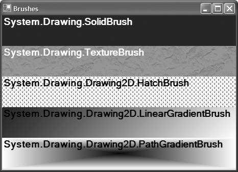 The System.Drawing.Brush class serves as a base class for several kinds of brushes, depending on your needs. Figure 4.3 shows the five derived brush classes provided in the System.Drawing and System.Drawing.Drawing2D namespaces.