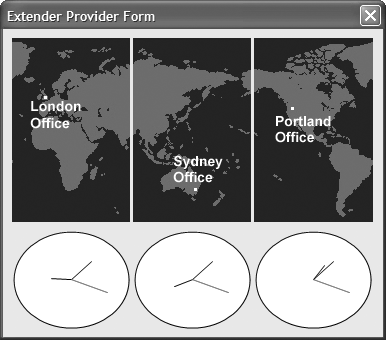 So far the discussion has focused on the properties implemented by a control for itself. TimeZoneModifier, an example of such a property, allows the clock control to be configured to display the time in any time zone. One way to use this feature is to display the time in each time zone where your organization has offices. If each office were visually represented with a picture box, you could drag one clock control for each time zone onto the form, manually adjusting the TimeZoneModifier property on each clock control. The result might look like Figure 9.15.