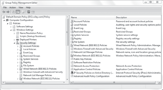 Figure 11.3 shows the Security Settings node of Group Policy for the Default Domain Policy. As you can see, many security settings can be manipulated. Other security settings are found in the Administrative Templates node.
