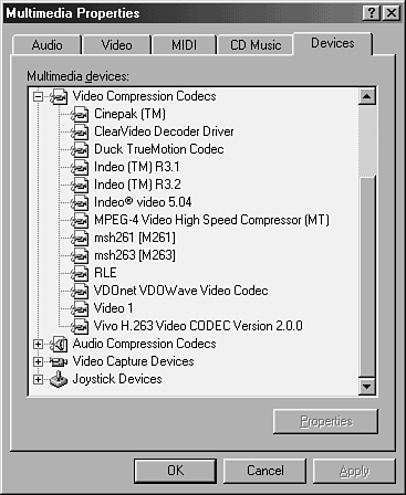 Figure 24.15. In the Devices tab of the Multimedia Properties dialog box, highlight the codec you want to remove.