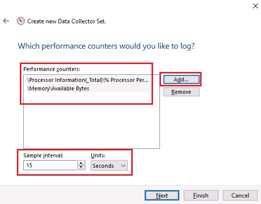 - Click the Add button to add counters, as in Figure 9.16, specify the time interval, and then click Next: