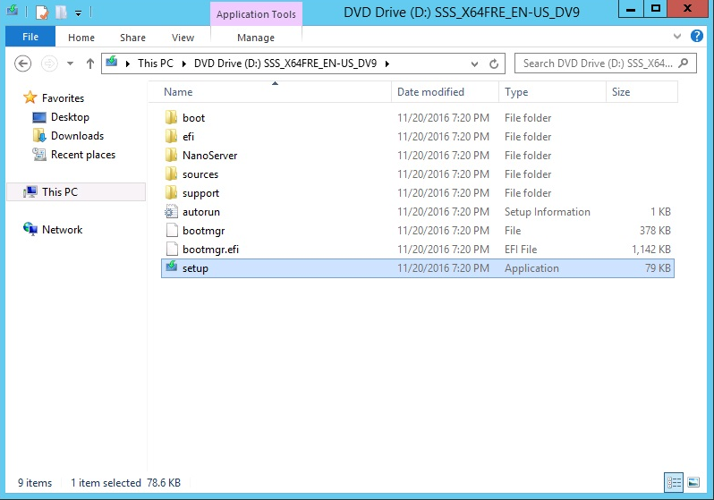 - Insert the Windows Server 2016 DVD disk, or plug in the USB flash drive, and run the setup file, as in Figure 2.24: