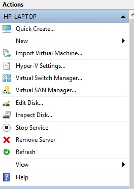 When it comes to managing virtual machines, the Actions pane and the VM's context menu offer plenty of options. From Quick create to Help, the Actions pane acts as a one-stop resource when it comes to creating VMs, setting up Hyper-V settings, creating virtual switches and virtual SANs, editing and inspecting disks, stopping services, removing servers, and refreshing as shown in Figure 6.16: