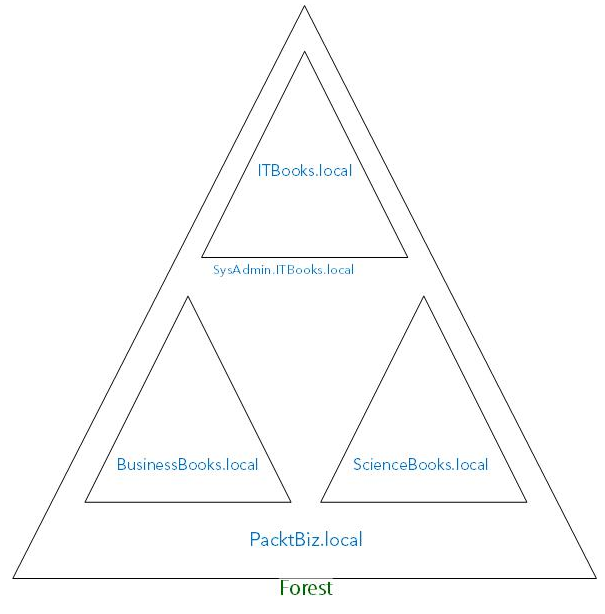 In our PacktBiz.local forest, we have created ITBooks.local, BusinessBooks.local, and ScienceBooks.local tree domains. Inside the ITBooks.local tree domain, we have created a child domain, SysAdmin.ITBooks.local. As you can see, all these tree domains share a common namespace within a forest. This is known as a contiguous namespace (see Figure 4.12):