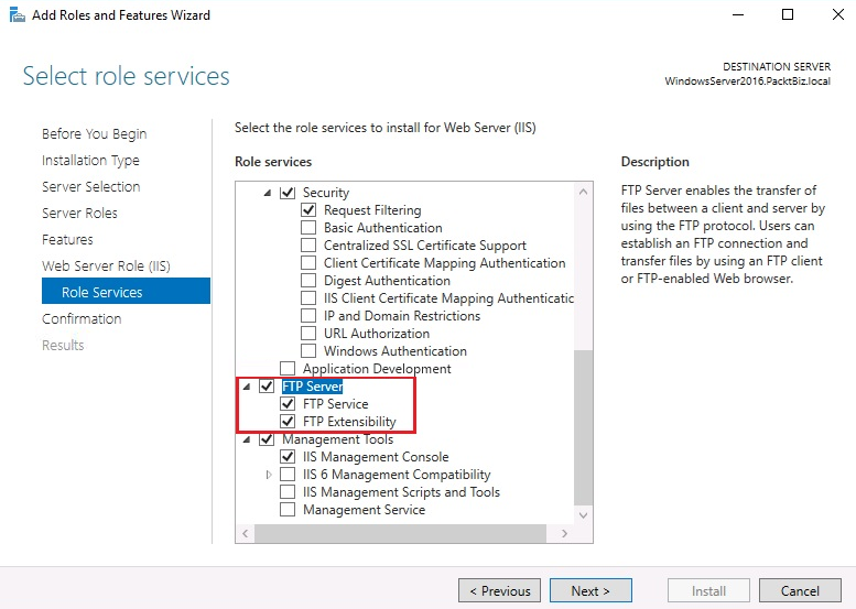 File Transfer Protocol (FTP) does exactly what its name indicates. FTP transfers files from computer to computer, computer to the server, or vice-versa, on a LAN or WAN (or the internet). To set up an FTP server in Windows Server 2016, first you need to add Web Server Role (IIS) as a role, and then FTP Server as a role service (see Figure 5.6):