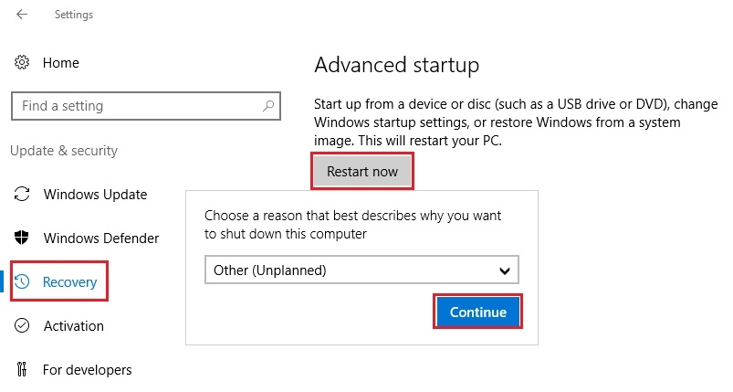 - Click the Restart now button and then Continue, as shown in Figure 2.2:
