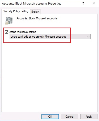 - Policy Setting: Users can't add or log on with Microsoft accounts