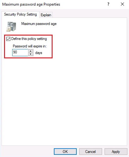 - Policy Setting: Define this policy setting by specifying the maximum age of password