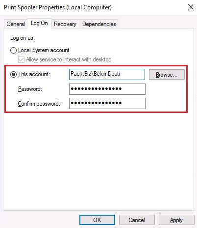 Figure 3.15. Setting up Log on settings for a service in Windows Server 2016