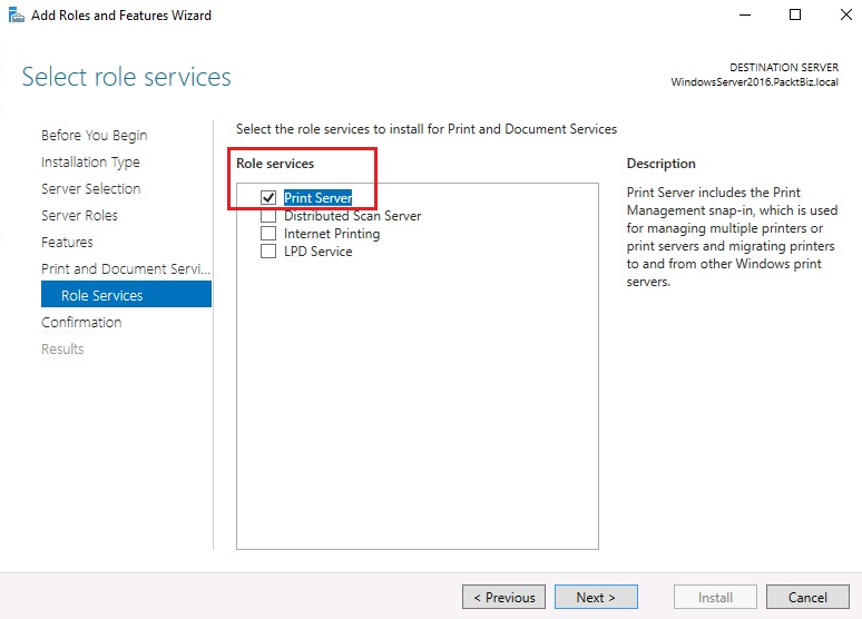 Network printers, unlike local printers, are dedicated printers on the computer network that provide printing services. Depending on the type of network interface that they own, these printers can be connected to a wired or wireless network. To set up a print server in Windows Server 2016, select the Print and Document Services (PDS) role and add Print Server role services as shown in Figure 5.22: