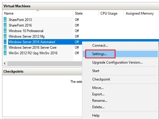 Keep in mind that virtual memory management is performed for every virtual machine, thus it is required that VMs be turned off prior to setting up memory settings. To manage virtual memory with Hyper-V Manager in Windows Server 2016, complete the following steps: