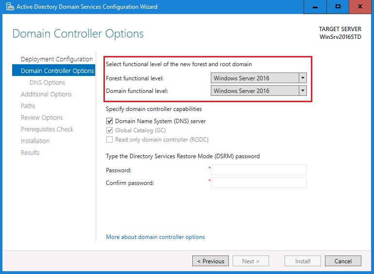 To set up the functional level in Windows Server 2016, use the Active Directory Domain Services Configuration Wizard as shown in Figure 4.11: