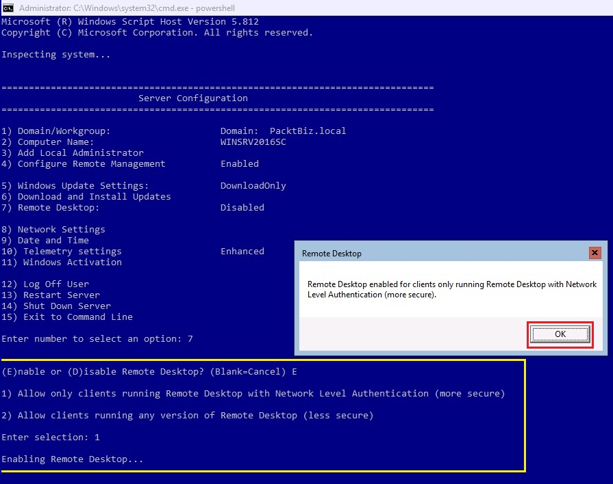 - In the Remote Desktop dialog box, click OK to confirm Remote Desktop enabling: